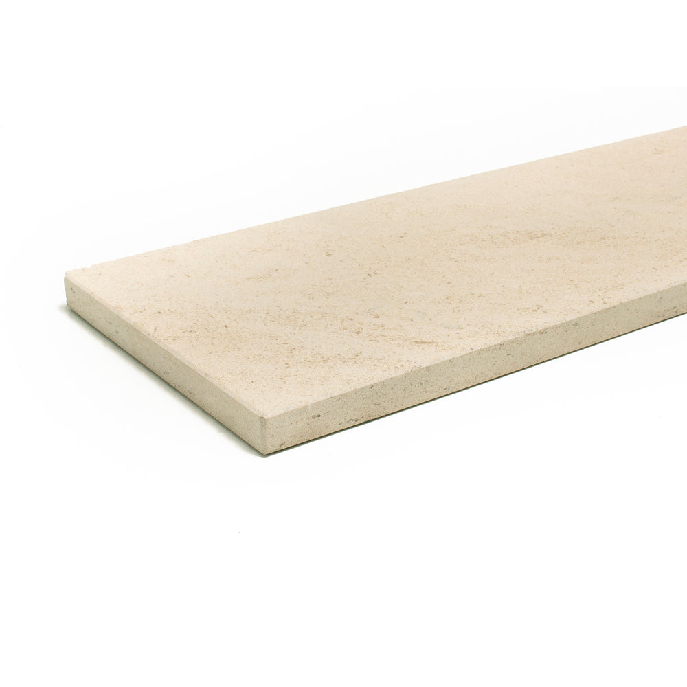 Tablette de fenêtre en pierre calcaire beige portugaise, d'une épaisseur de 2 cm. La surface est entièrement polie et les côtés visibles sont biseautés. Les tablettes sont disponibles en plusieurs dimensions standard, mais peuvent également être fabriqués sur mesure pour répondre aux besoins spécifiques du client.